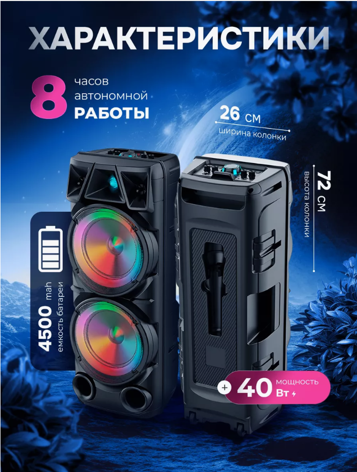 | Комплектация | - Беспроводная высокомощная колонка BT Speaker ZQS-8210; - Беспроводной микрофон; - Зарядный кабель USB; - Пульт дистанционного управления; - Инструкция по эксплуатации. |