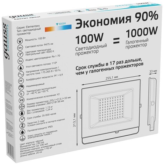 Прожектор Gauss Elementary 100W 9475lm IP65 4000К черный 1/4 информация: