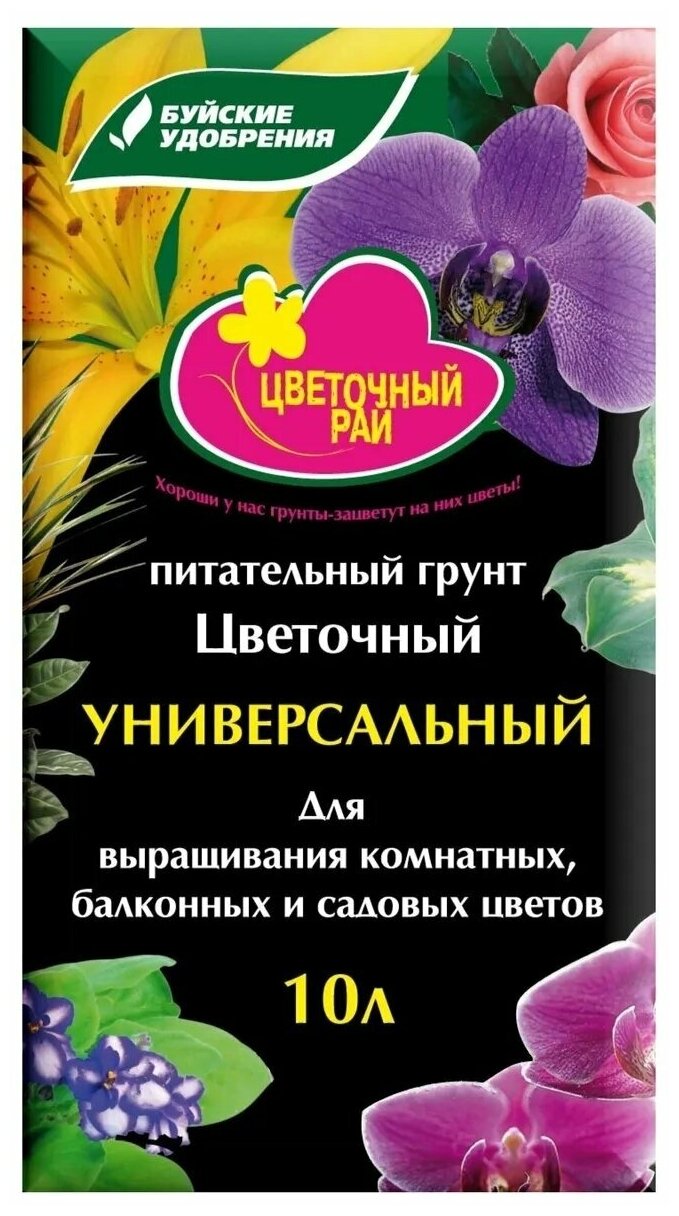 Грунт Буйский химический завод Цветочный рай Универсальный Для выращивания комнатных, балконных и садовых цветов, 10 л информация: