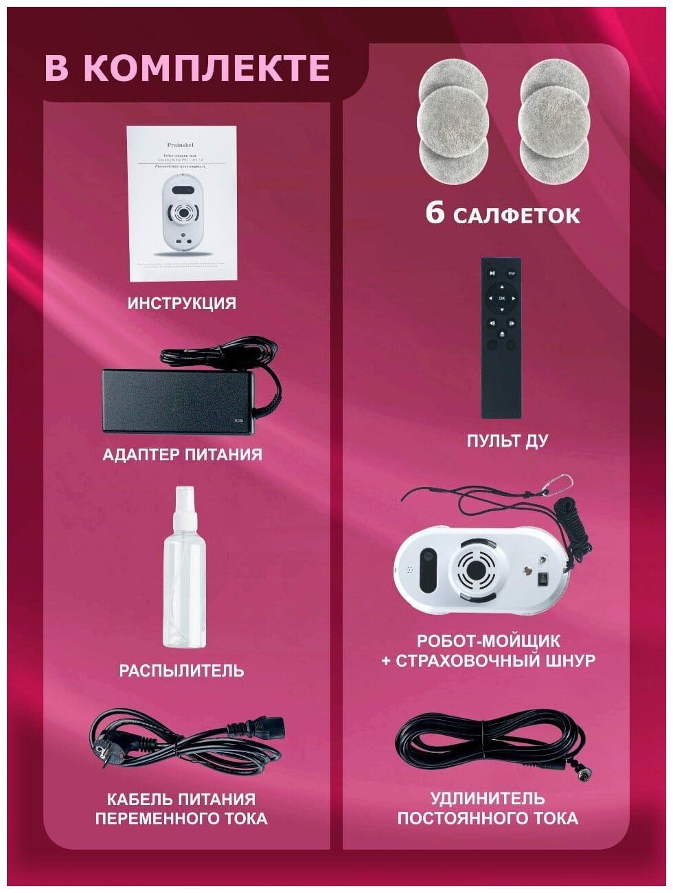 | Дополнительная информация | Робот для мойки окон - 1шт. Страховочный шнур - 1 шт. Пульт дистанционного управления - 1 шт. Адаптер питания - 1 шт. Кабель питания переменного тока - 1 шт. Удлинитель постоянного тока - 1 шт. Распылитель - 1 шт. Чистящие салфетки - 6 шт. Руководство пользователя на русском языке - 1 шт. |