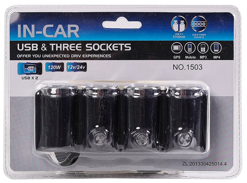 Разветвитель прикуривателя 2USB 3 разъема 12-24V (NO 1503) информация: