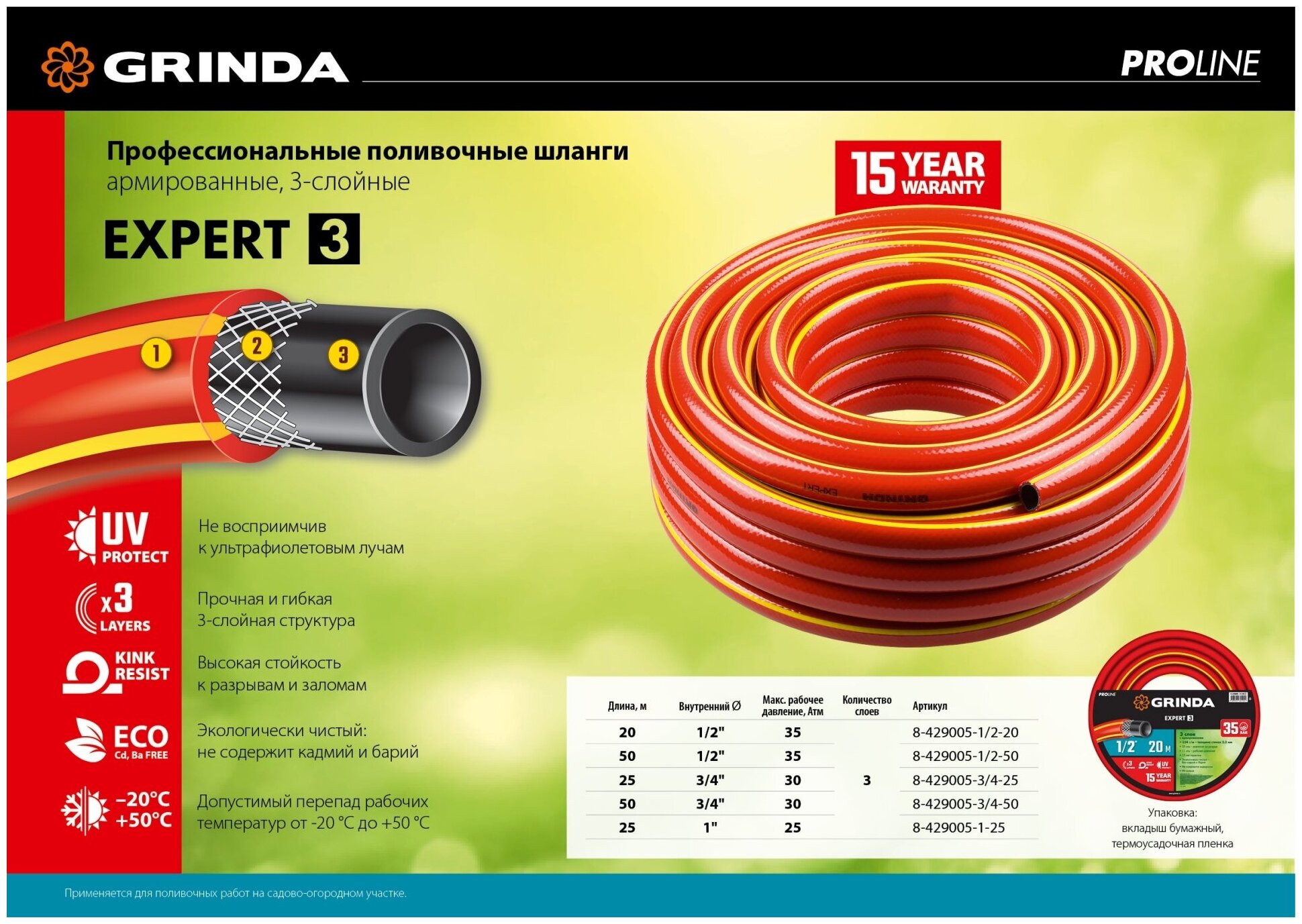 Отзывы на Поливочный шланг GRINDA PROLine EXPERT 3 1/2? 20 м 35 атм трёхслойный армированный