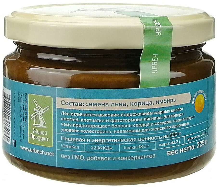 Урбеч Живой Продукт из семян льна с корицей и имбирем 225 гр. информация:
