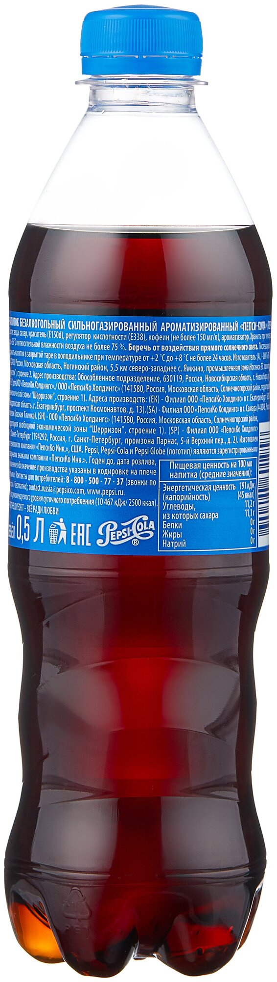 Газированный напиток Pepsi Cola, 0.5 л, пластиковая бутылка