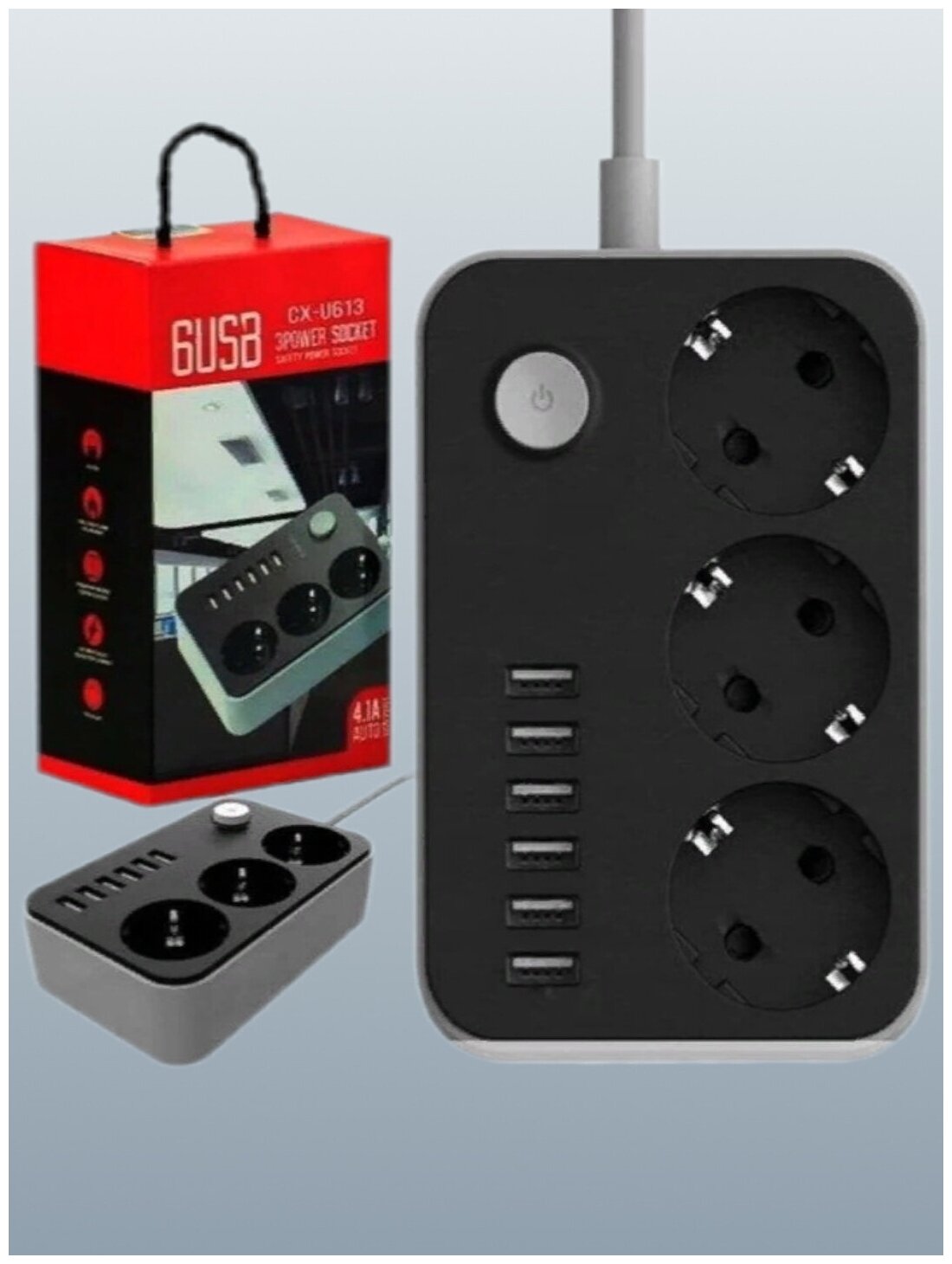 Отзывы на Сетевой фильтр удлинитель USB / 3 Евро розетки с защитой от замыкания / 6 USB 4.1A быстрая зарядка / Черный