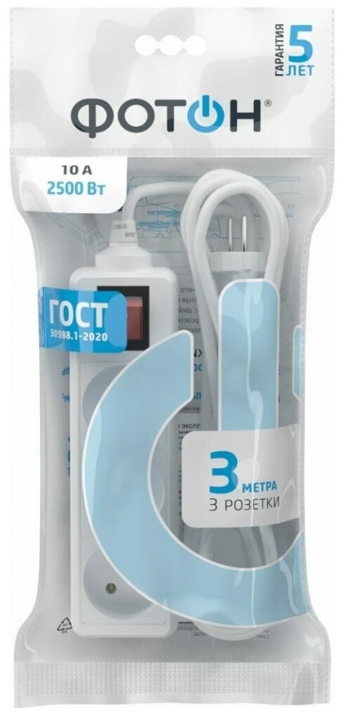 Отзывы на Удлинитель сетевой "фотон" 10-33S, 3 метра, 3 розетки, 10А, с выключателем, Белый, ГОСТ