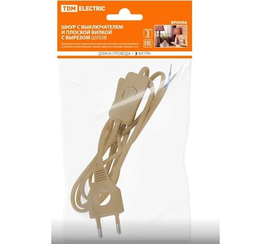 Отзывы на Шнур с выключателем и плоской вилкой с вырезом ШУ03В ШВВП 2х0,75мм2 2 м. бронза TDM