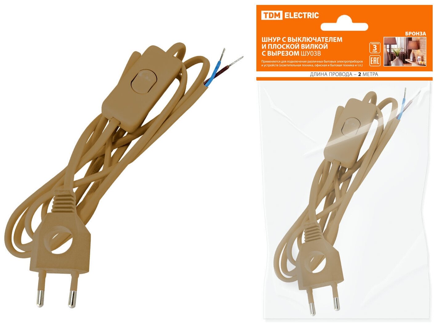 Шнур с выключателем и плоской вилкой с вырезом ШУ03В ШВВП 2х0,75мм2 2 м. бронза TDM информация:
