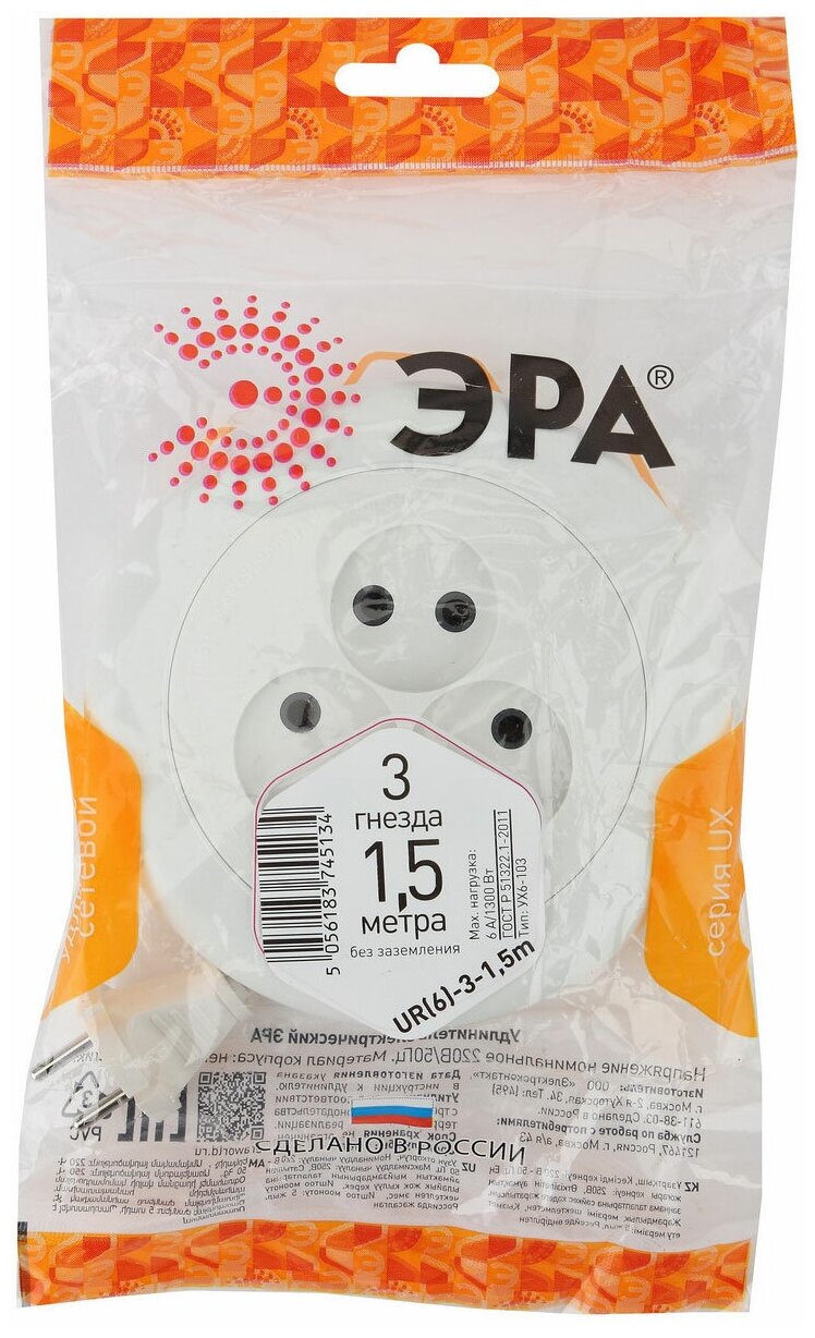 Отзывы на Удлинитель ЭРА UR(6)-3-1 5m ЭРА рулетка без заземления 3гн 1 5м ШВВП 2x0.75мм2 6А (УХ6-103)