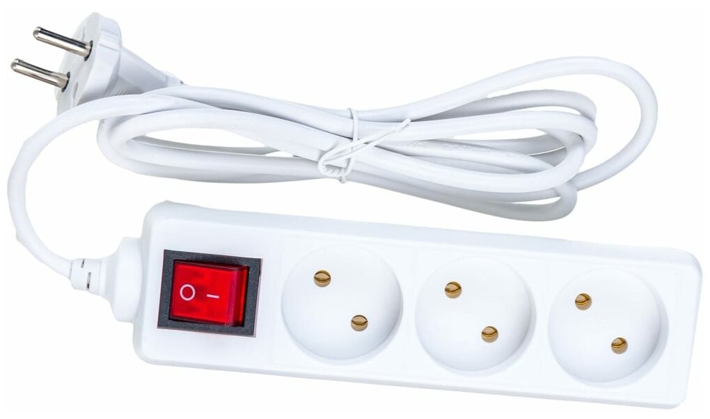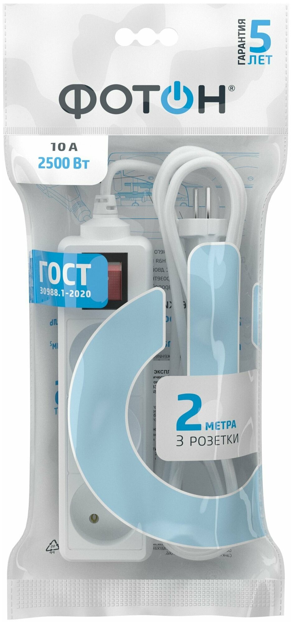 Удлинитель сетевой для розетки фотон 10А 2 метра 3 розетки с выключателем белый, ГОСТ 723 ₽