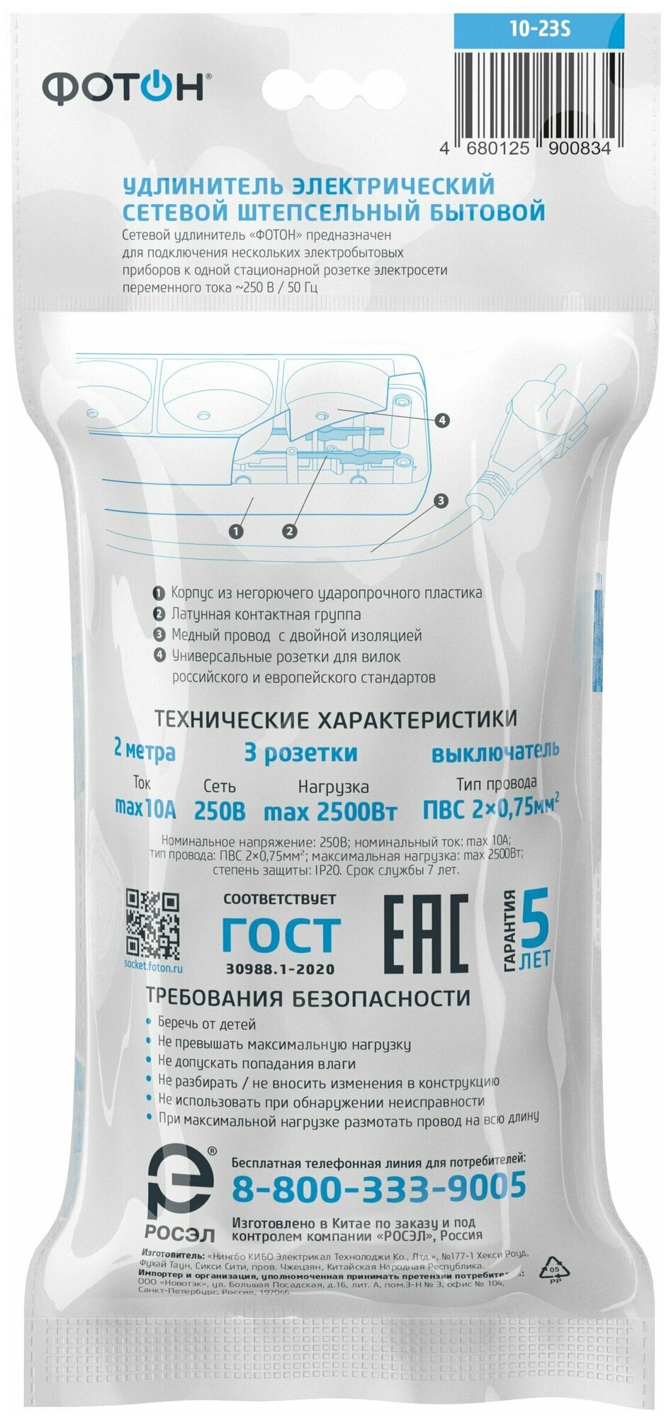 Фотон сет. удл. ПВС 2х0.75 3 роз. 2м 10А белый,выкл. 10-23S, арт.24745 информация: