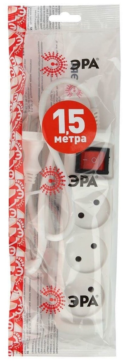 Удлинитель ЭРА U-3s-1 5m-2x1 без заземления с выключателем 3 розетки 1 5м 10А информация: