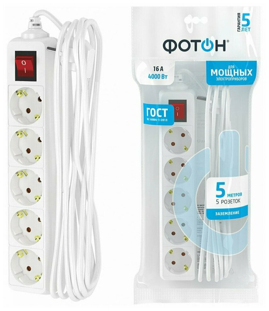 Удлинитель сетевой "фотон" 16-55ЕS, 5м, 5 розеток, с заземлением , белый, ГОСТ информация: