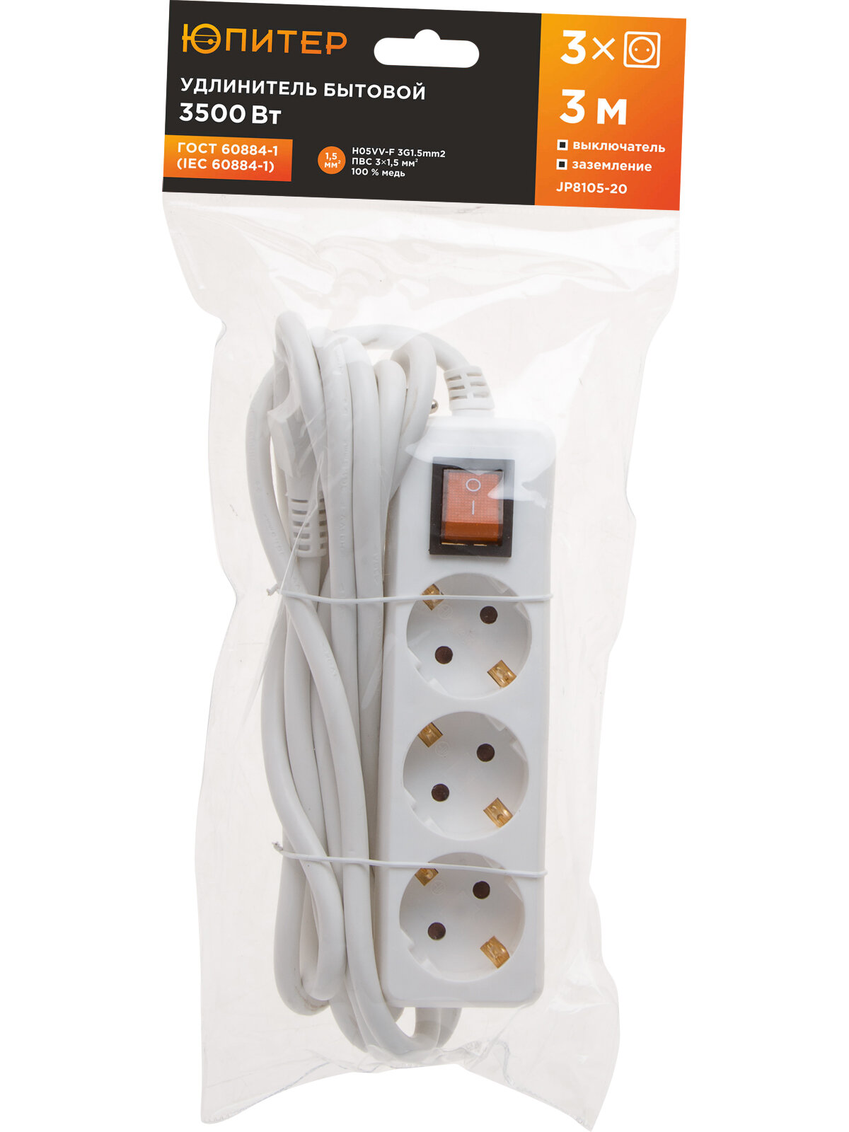 Удлинитель 3 м 3 розетки 3,5 кВт с заземлением юпитер (JP8105-20) информация: