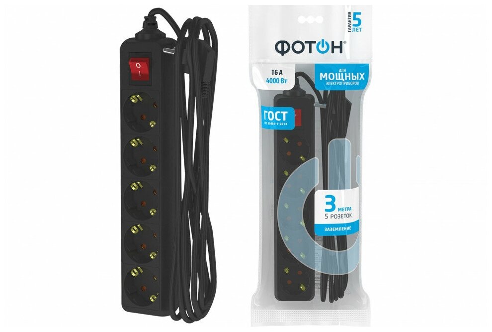 Отзывы на Удлинитель сетевой "фотон" 16-35ЕS, 3м, 5 розеток, с заземлением , черный, ГОСТ