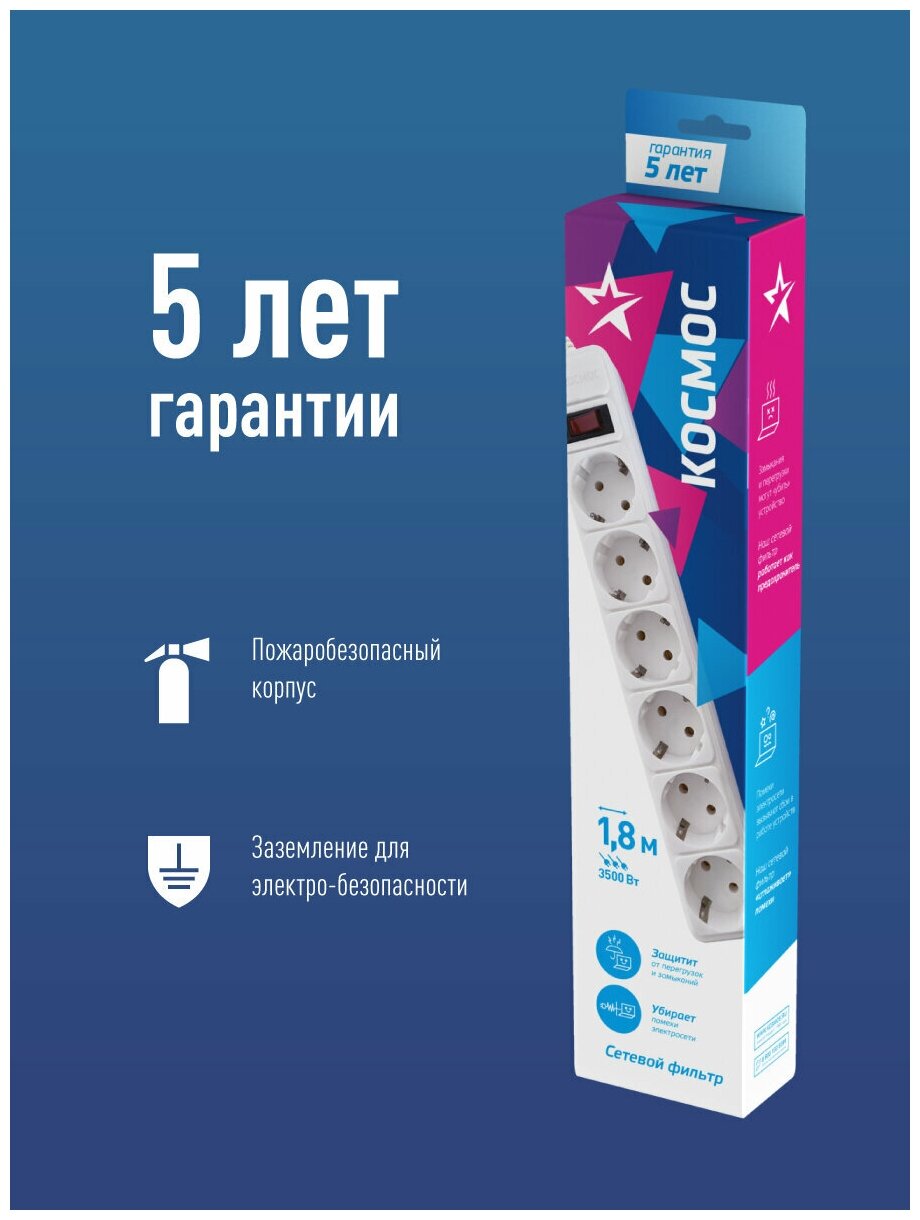 Сетевой фильтр Космос Электро Космос 6х1.8м с заземл. 16А IP20 3.5кВт с пред. 3х1 индик. сети, белый, FKsm1.8m-6g(W)16A информация:
