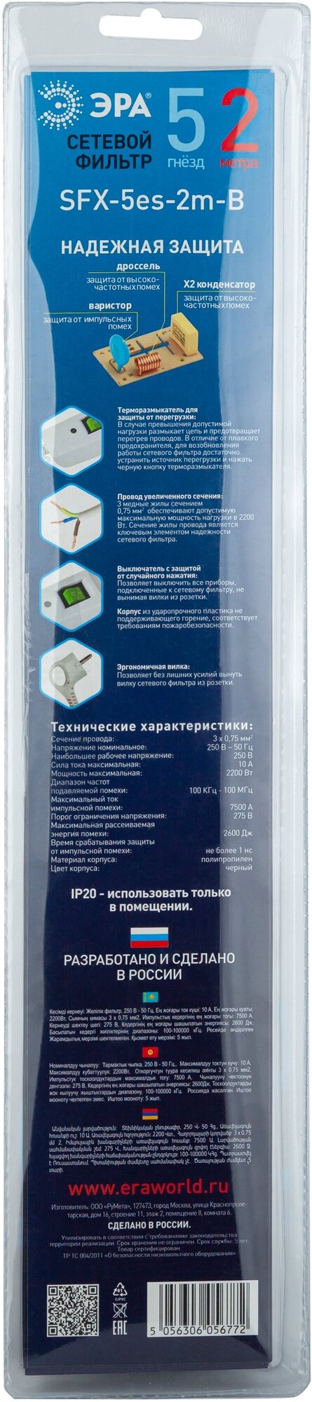 Сетевой фильтр ЭРА SFX-5es-2m-B с надежной защитой с заземлением с выключателем 5 розеток 2м 10А черный информация: