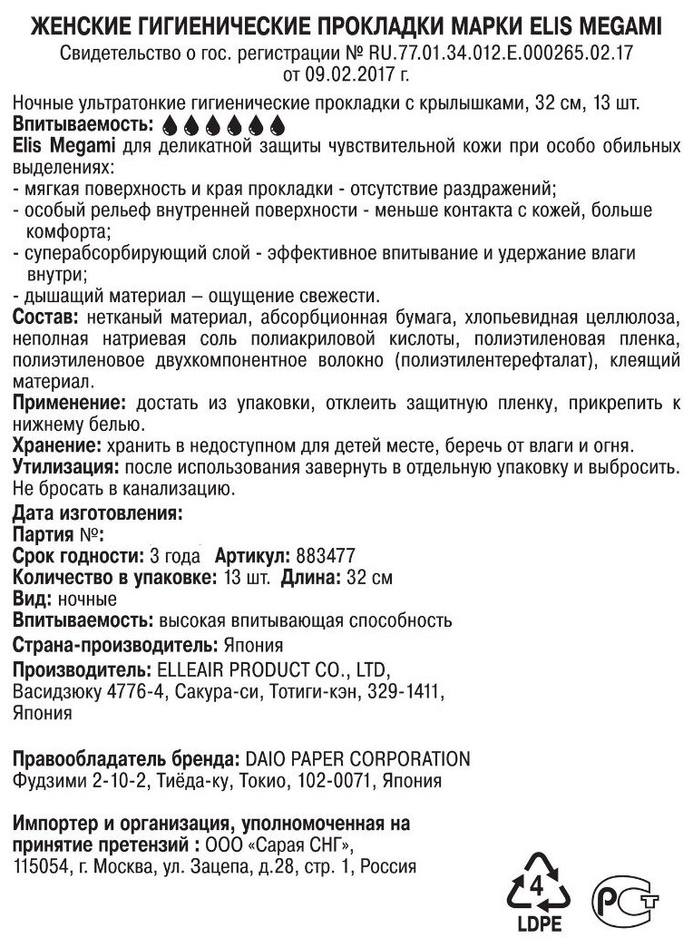 Отзывы на Прокладки гигиенические Elis Megami, ночные, с крылышками, 6 капель, 13 шт, длина 32 см