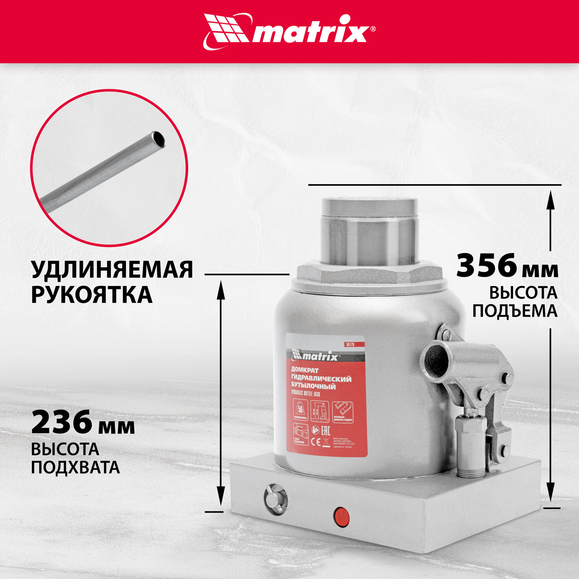 Домкрат гидравлический бутылочный, 50 т, h подъема 236-356 мм Matrix MATRIX информация: