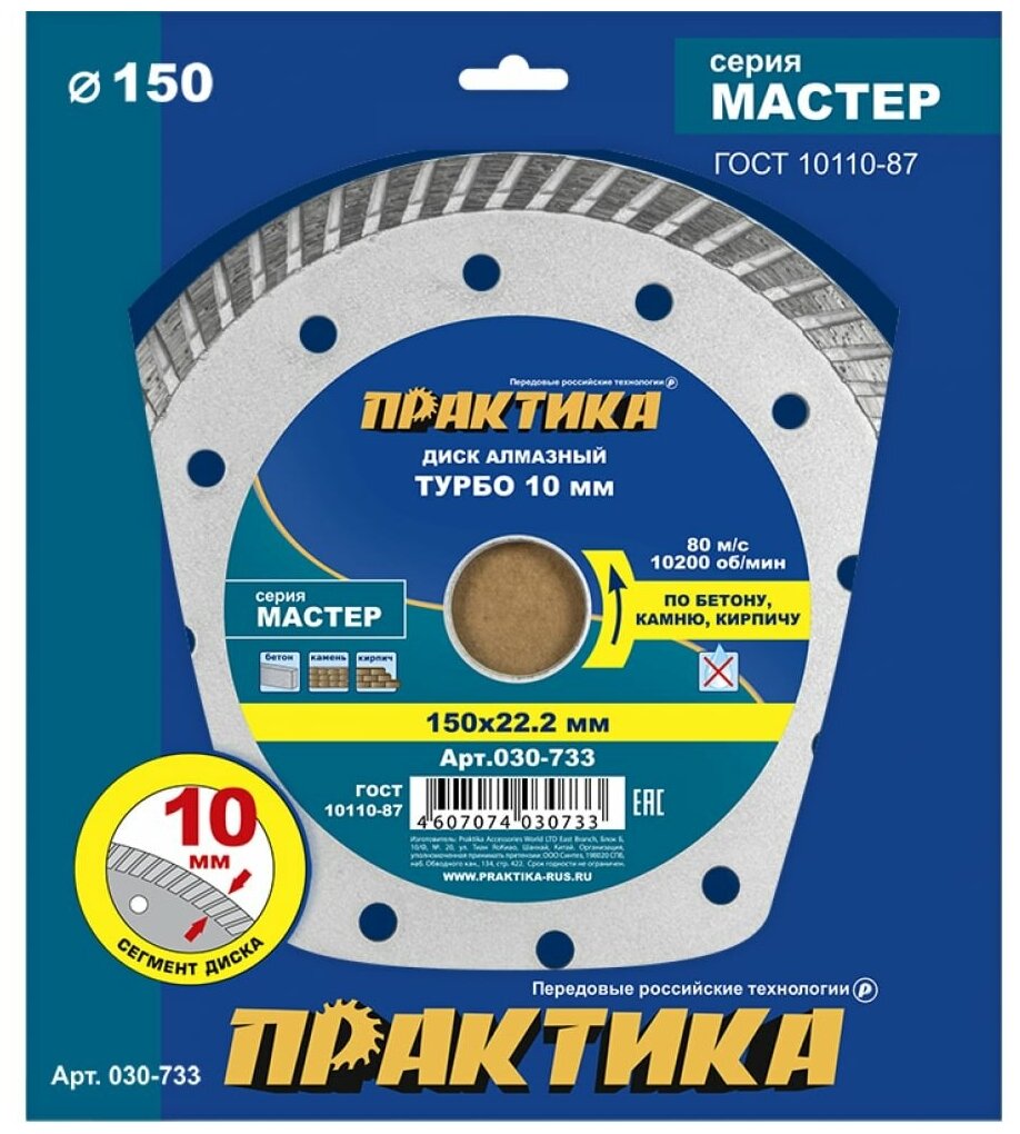Диск алмазный турбированный ПРАКТИКА "Мастер" 150 х 22 мм (1 шт.) коробка ("Мастер", 150х22мм, коробка) информация: