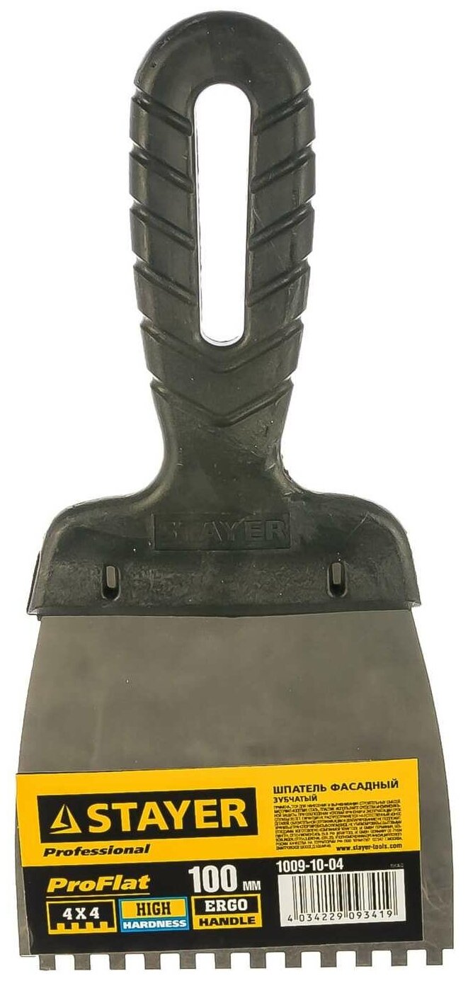 STAYER PROFlat, 100 мм, зуб 4 х 4 мм, пластиковая ручка, зубчатый, нержавеющий, фасадный шпатель, Professional (1009-10-04)
