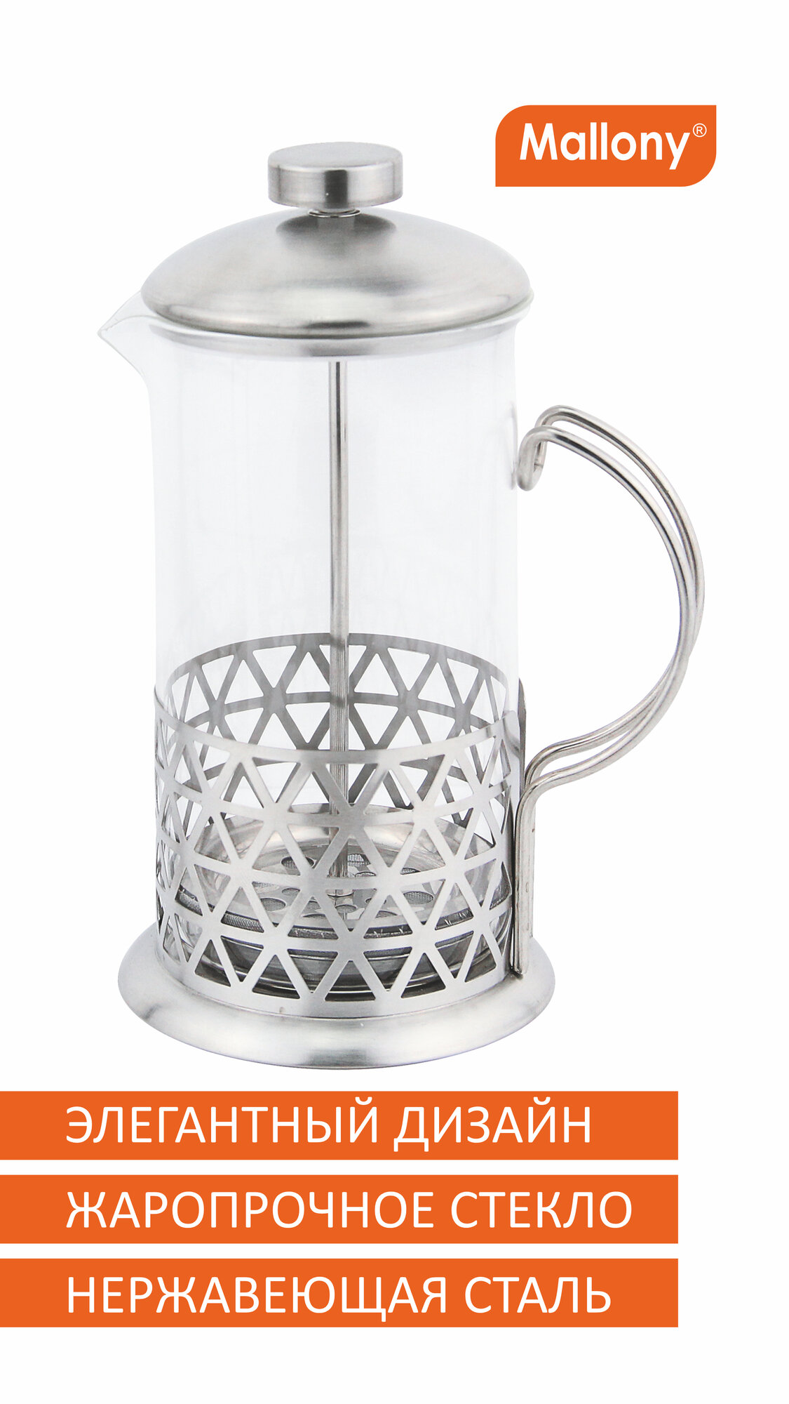 Чайник заварочный френч-пресс Mallony / Мэллони ROMBO 005488 прозрачный, нержавеющая сталь 1л / посуда для чая