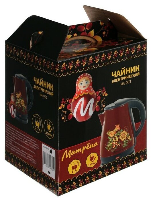 Матрёна Чайник электрический "Матрёна" MA-003, металл, 1.7 л, 1500 Вт, серый с рисунком "Хохлома"