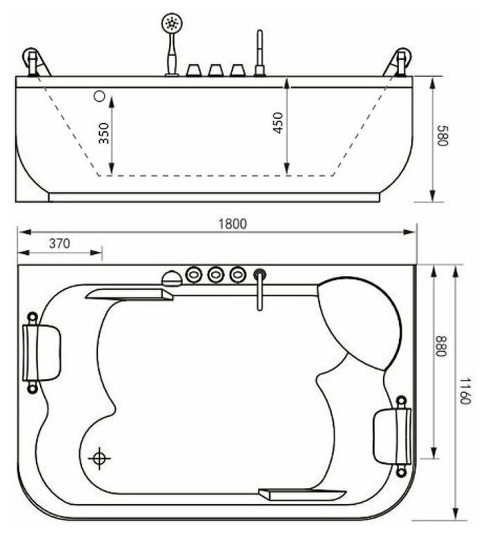 | Подробная комплектация | ванна, каркас, подголовники нет 2шт., система слива/перелива, смеситель с изливом, душевая лейка, съемная панель |