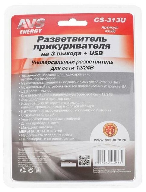 Разветвитель прикуривателя AVS CS313U, 12/24 В, 3 выхода + USB 4784786 .