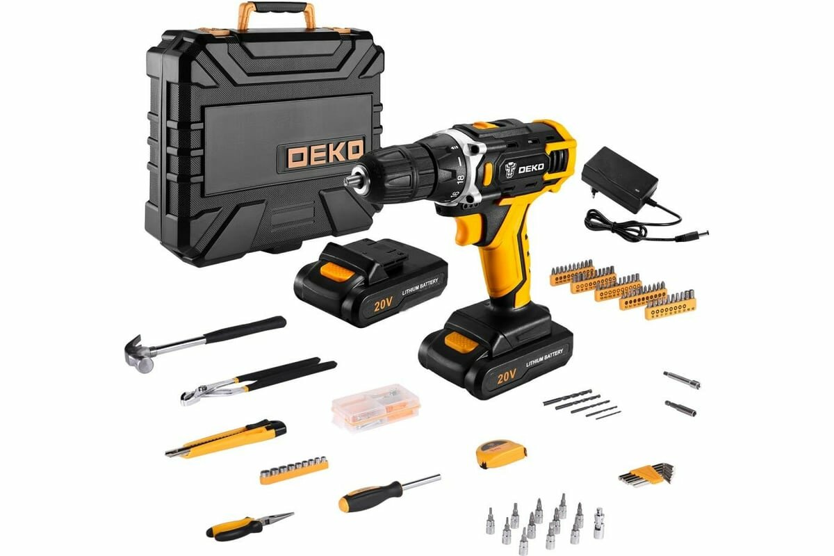 Дрель-шуруповерт DEKO DKCD20FU-Li и набор инструментов DEKO, 20 В, 2 Li-lon, 195 предметов информация:
