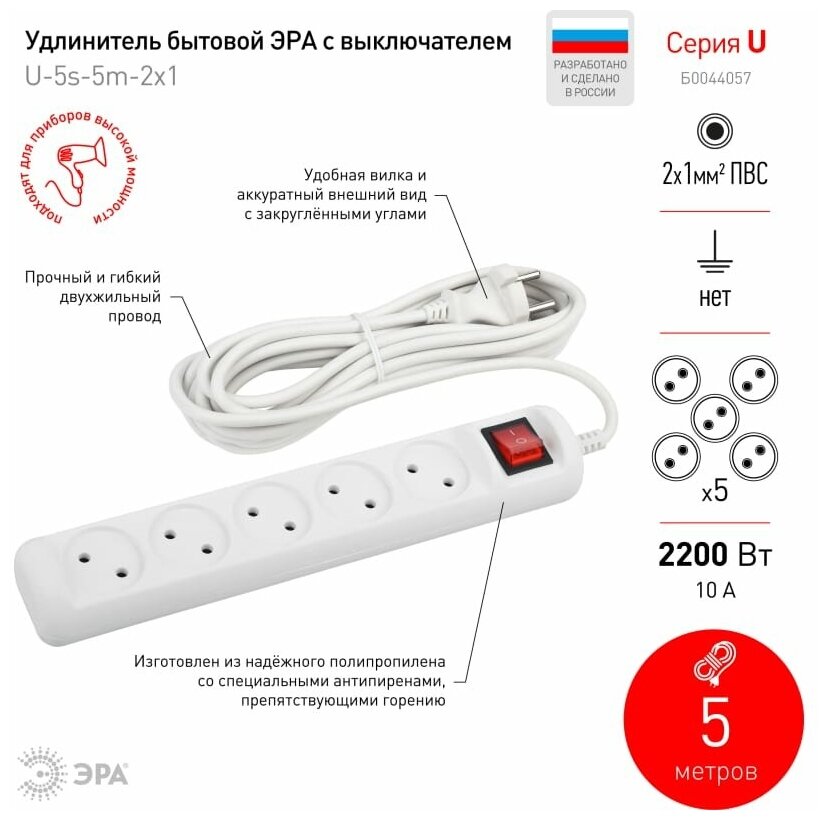 Удлинитель электрический ЭРА U-5s-5m-2x1 без заземления c выключателем 5 розеток 5м ПВС 2x1мм2 10А информация:
