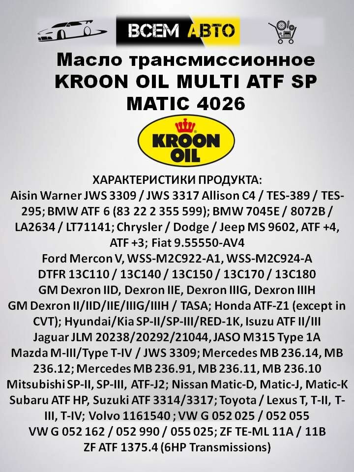 Масло Трансмиссионное Sp Matic 4026 1L KROON OIL арт. 32219 информация: