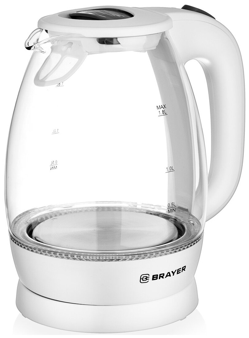 Чайник BRAYER BR1013WH, 1,8 л, 2200 Вт, закрытый нагревательный элемент, стекло, белый