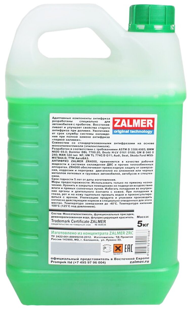 Антифриз ZALMER ZR4000 LLC G11 (зеленый) 5л. информация: