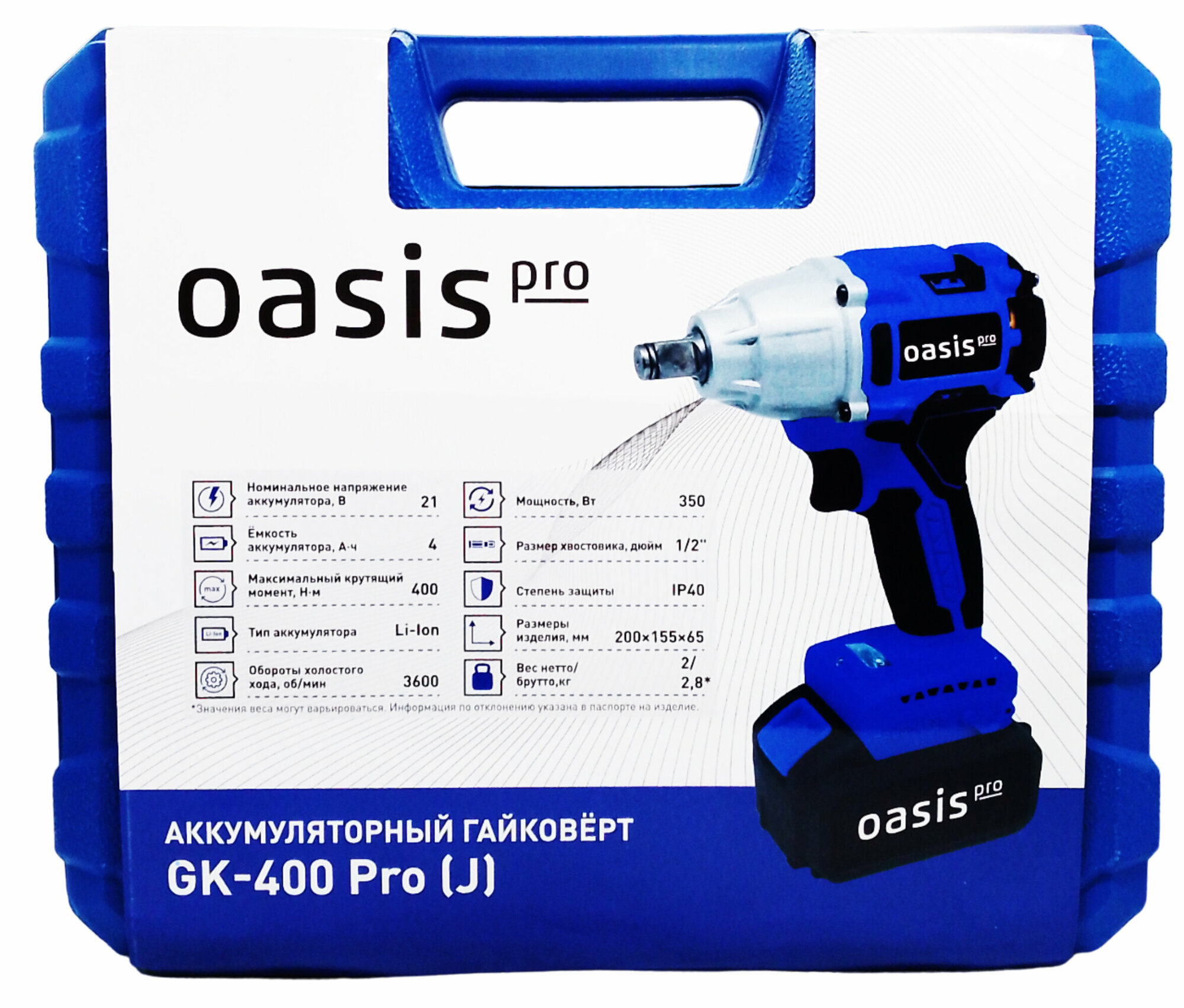 | Комплектация | Аккумуляторный гайковёрт – 1 шт. Зарядное устройство – 1 шт. Аккумуляторная батарея – 2 шт. Кейс для хранения и транспортировки – 1 шт. Инструкция – 1 шт. |