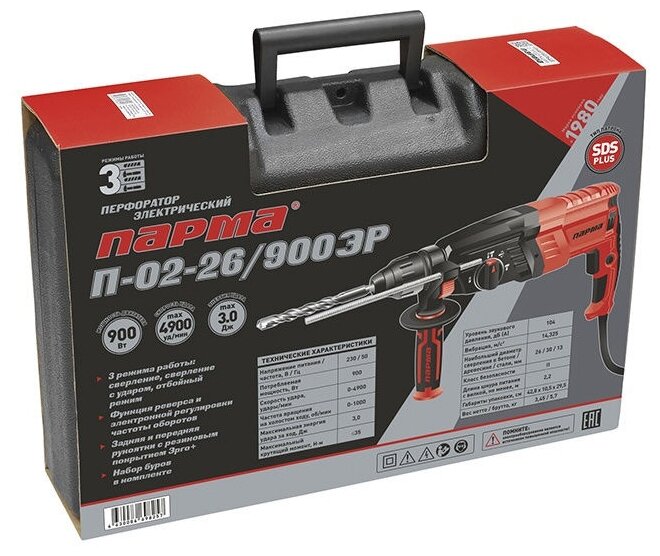 Перфоратор парма SDS-plus П-02-26/900ЭР (900Вт,3реж,3.0Дж,бетон 26мм) 3.45кг кейс+5 насадок