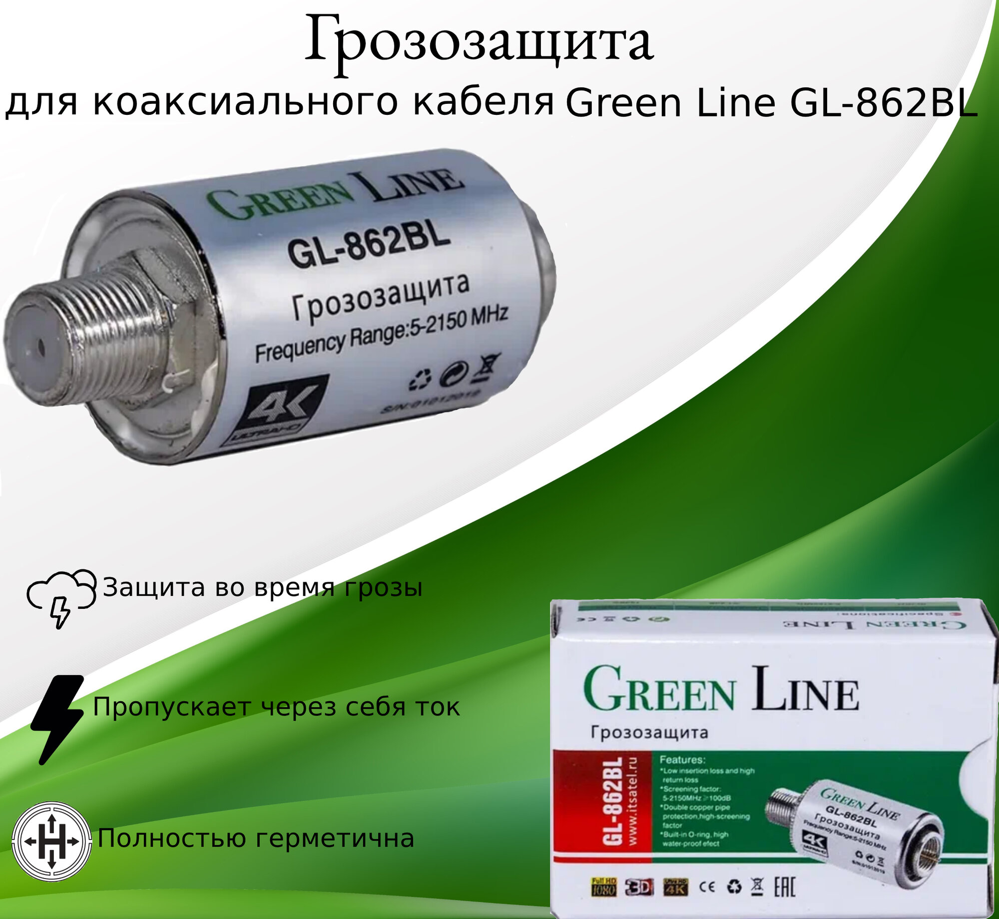 Грозозащита для коаксиального кабеля Green Line GL-862BL диапазон 5-2150 мГц информация: