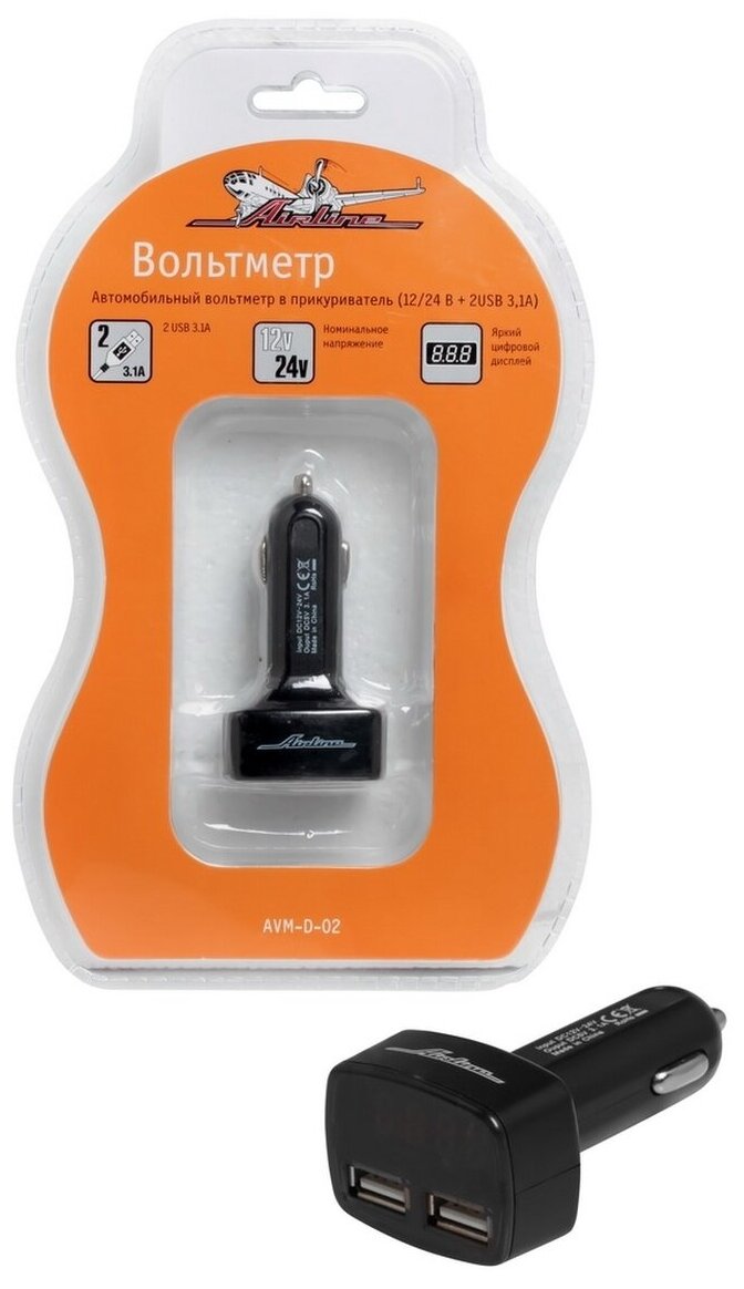 AIRLINE AVMD02 вольтметр + 2USB 3,1A В 12-24В(AVM-D-02) информация: