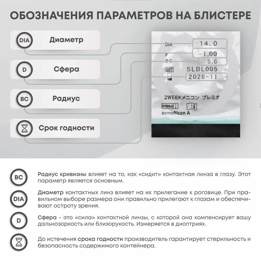 PremiO Японские линзы +0.25, Диаметр 14.0, Кривизна 8.6, 6 штук (линз), двухнедельные контактные. (Премио Меникон). Срок замены линзы - 2 недели 3 200 ₽