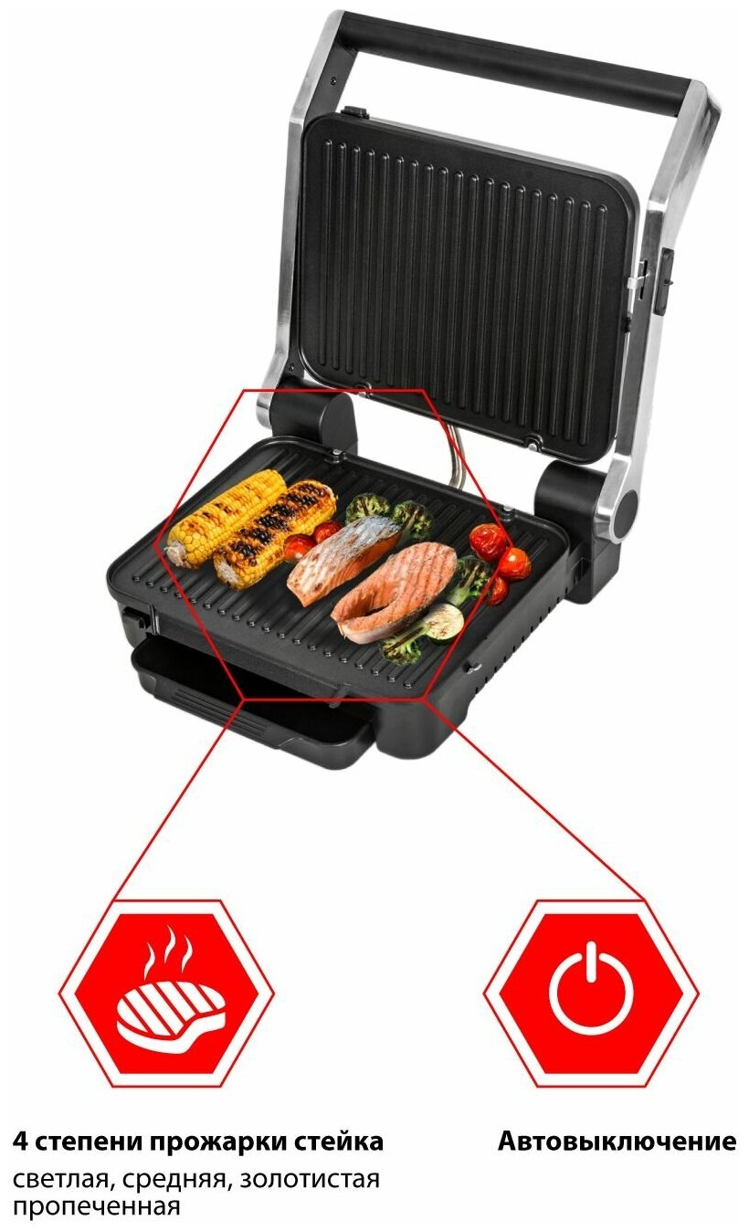 Гриль JVC со съемными двусторонними антипригарными панелями, 9 режимов приготовления, 4 степени прожарки стейка, автоотключение, 2200 Вт информация: