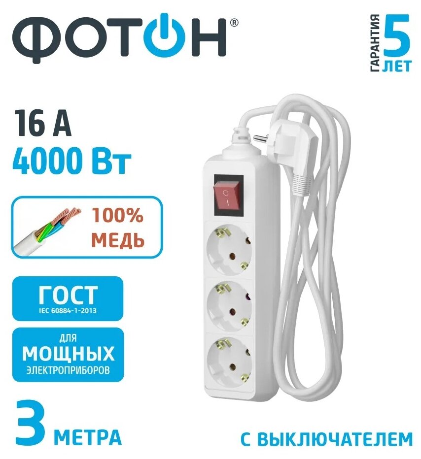 Удлинитель сетевой для розетки фотон 16А 3 метра 3 розетки с выключателем с заземлением белый, ГОСТ 999 ₽