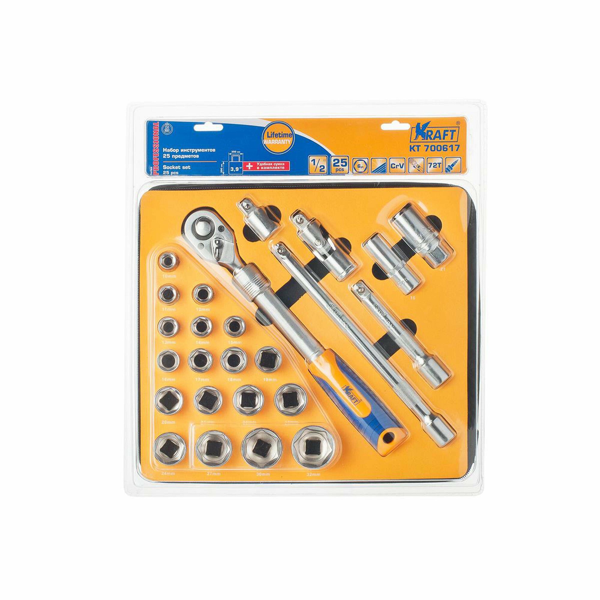 KRAFT KT700617 Набор инструмента 25 предметов 1/2"Dr (ложемент с сумкой в блистере) KRAFT