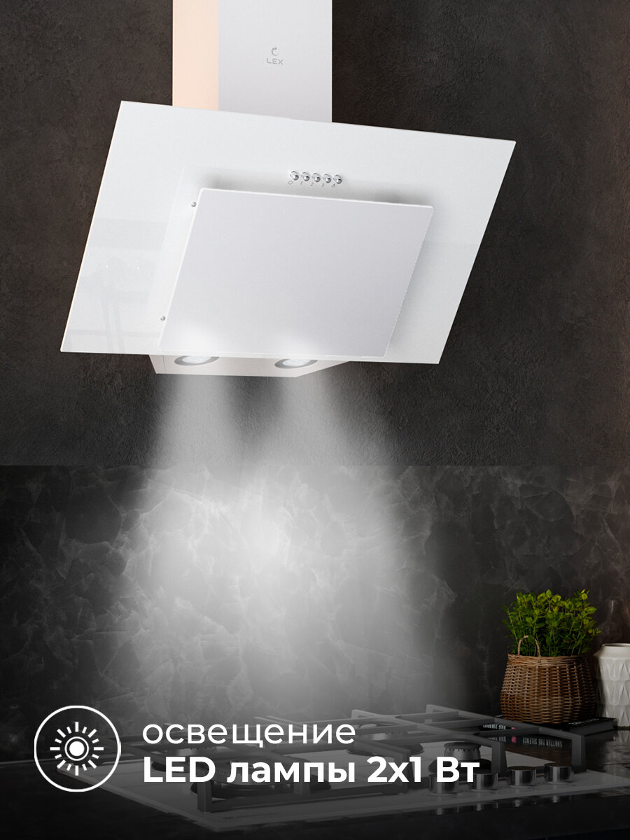 Наклонная кухонная вытяжка LEX MIO G 600 WHITE, 60 см, отделка: стекло, кнопочное управление, LED лампы, белый.