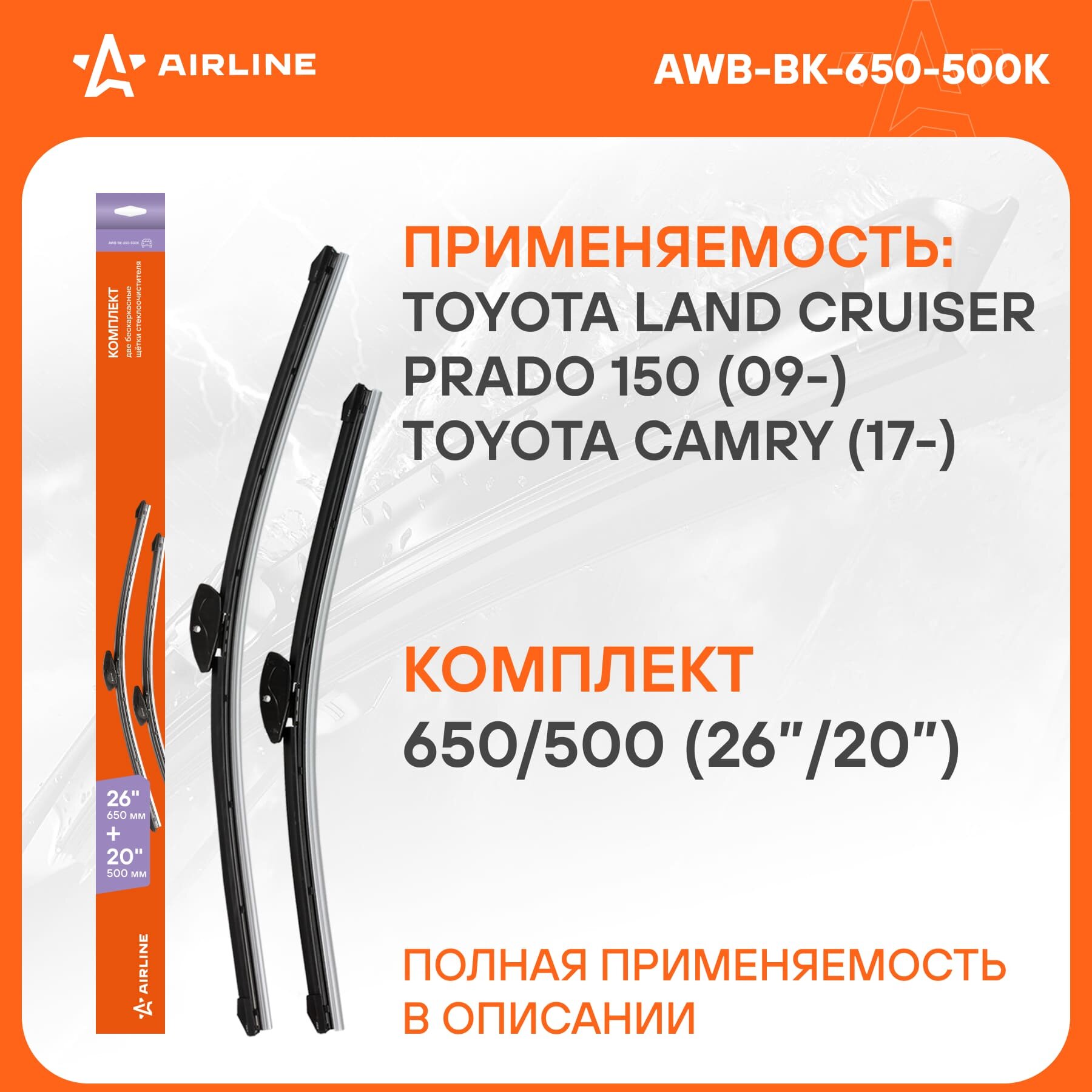 Щетки стеклоочистителя 650/500мм (26"/20") бескаркасные для а/м Toyota Land Cruiser Prado 150 (09-), Camry (17-), 2 шт. 3 типа адптр AWB-BK-650-500K AIRLINE информация: