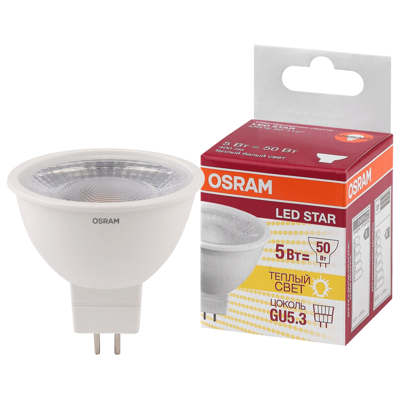 Лампа светодиодная OSRAM LED Star MR16, 400лм, 5Вт, 3000К, теплый белый свет, Цоколь GU5.3, колба MR16, софит