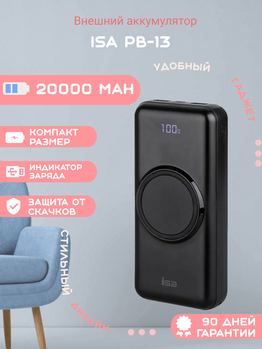 Внешний аккумулятор Power bank ISA PB-13 20000 mah с функцией беcпроводной зарядки, черный /Power bank с беспроводной зарядкой /беспроводной повербанк