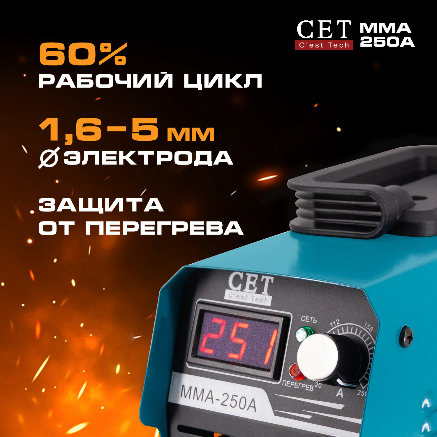 Сварочный аппарат инверторный / сварочный инвертор CET MMA 250A с дисплеем, электрод до 5 мм, 60% ПВ