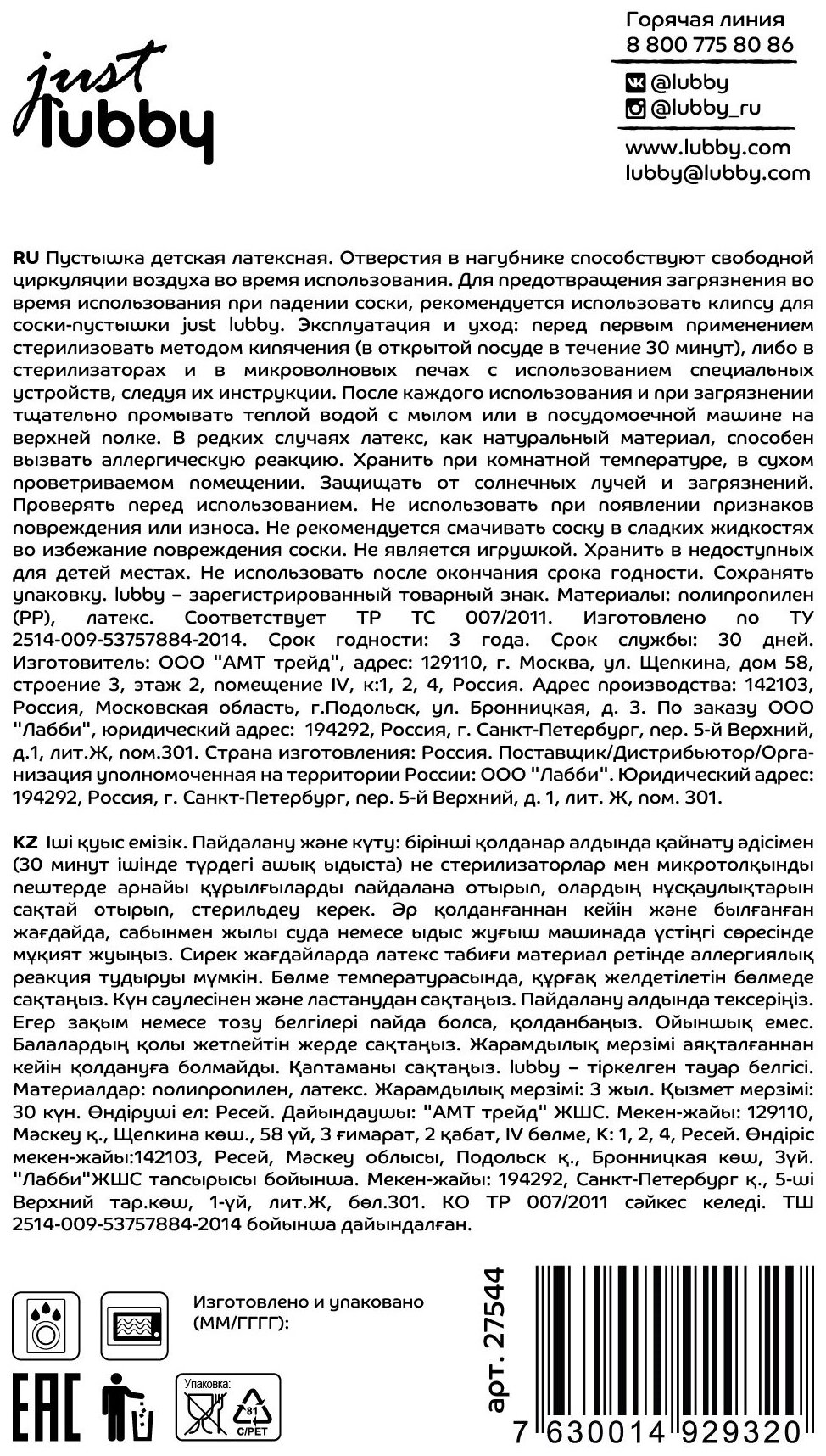 Пустышка JUST LUBBY, с латексным круглым соском, от 6 месяцев 27544 информация: