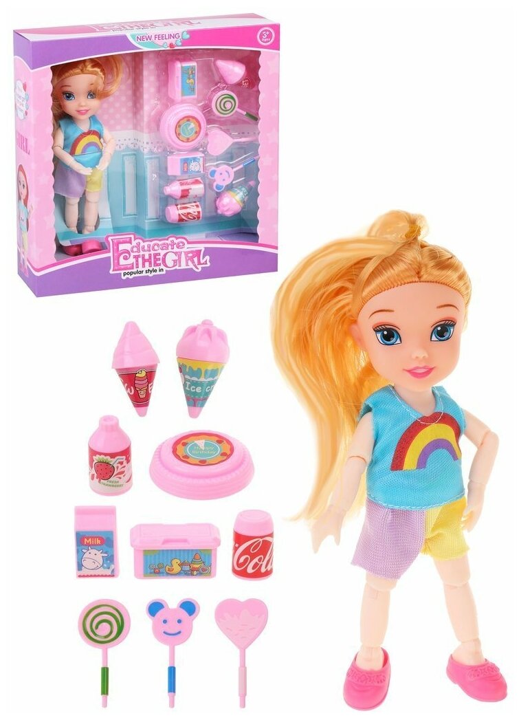 | Комплектация | кукла, леденцы, кола, молоко, торт, мороженое |