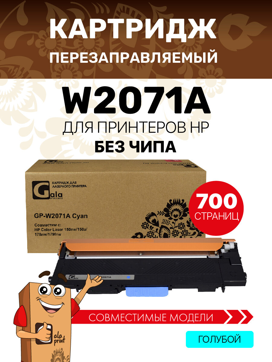 Картридж GalaPrint W2071A 117A без чипа для HP Color Laser 150nw/150a/178nw/179fnw лазерный, совместимый, цвет голубой информация: